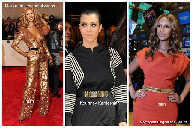 Mais cintos metalizados. Alguns apostam em usar cinto com logomarca, como este da Moschino