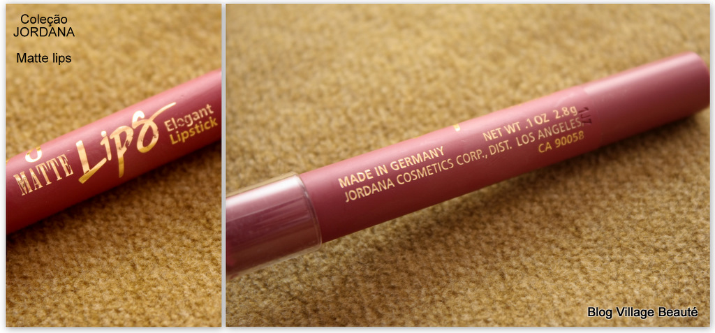 Este batom jumbo é feito na Alemanha, mas a empresa Jordana Cosmetics é americana. Na embalagem está escrito Matte Lips Elegant lipstick.