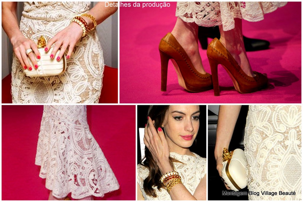 Anne Hathaway optou por jóia, maquiagem e cabelo muito discretos o que foi bom, ao meu ver, afinal o vestido é bem rico em detalhes.