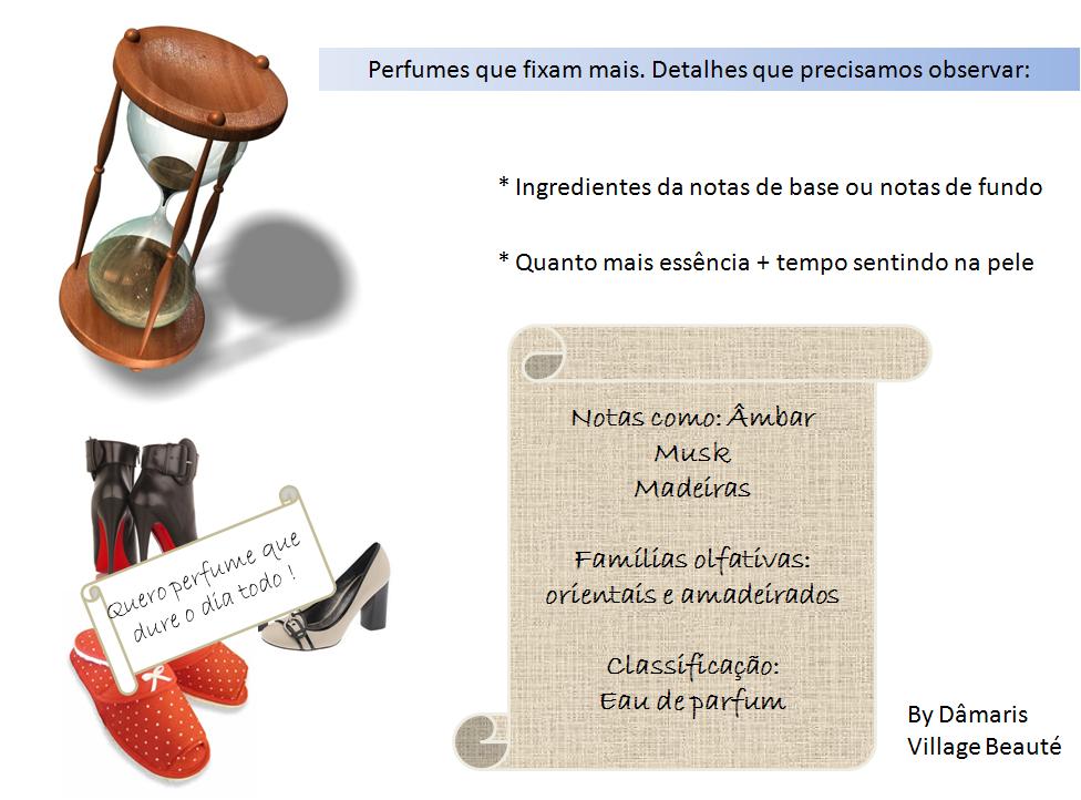 Não há 1 componente para colocarmos na receita de um perfume para fazê-lo durar mais tempo. O que devemos observar quando formos comprar um perfume novo é o seguinte: